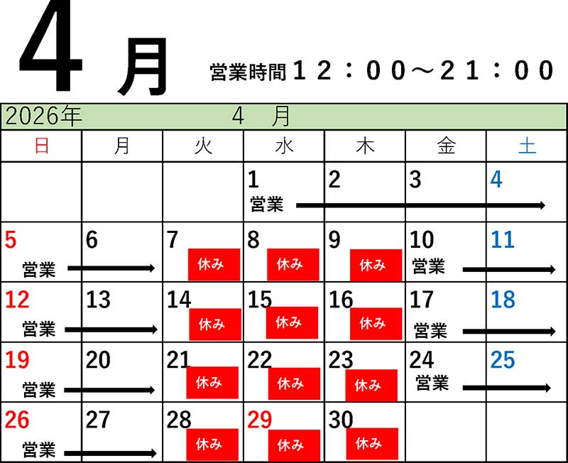 2025年11月14日より、営業時間を12:00~21:00に変更